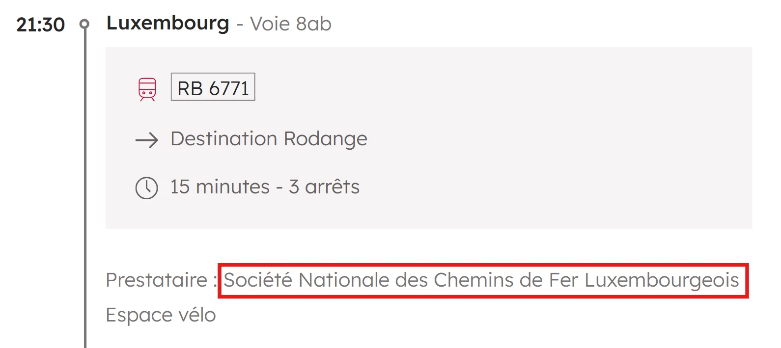 Via la recherche d’itinéraire, il est possible de rechercher des trajets et des trains. Pour chaque train d’une correspondance, l’opérateur (Prestataire) est indiqué.